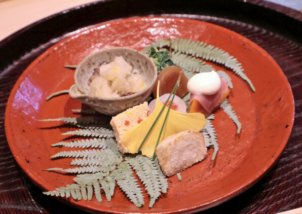 なまこみぞれ和え、菊菜お浸し、すけこ落雁、唐墨烏賊巻き粕漬け、スモークサーモン砧巻き、柿白和え、海老芋素揚げ