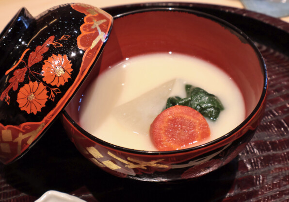 聖護院大根、金時にんじん、ちぢみほうれん草。自家製柚子こしょうが添えられました。