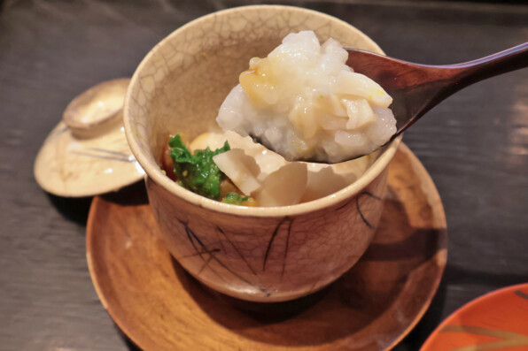 先付に、蕪のお粥。押し麦入り。蕪のペーストと帆立を炊いた地を使ったということ。リゾット風。