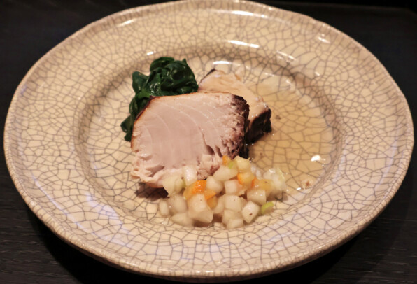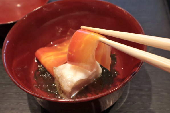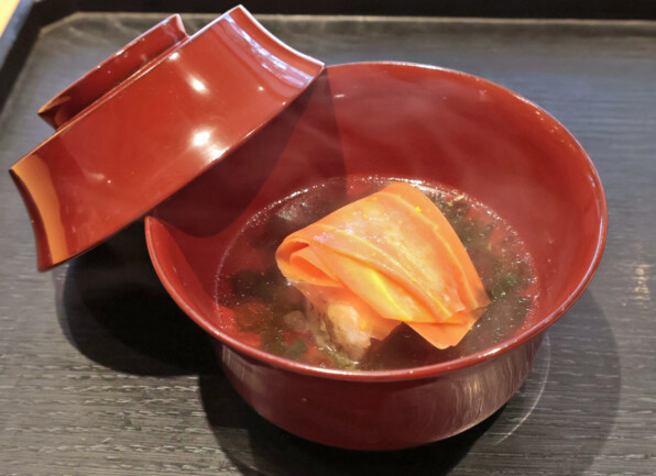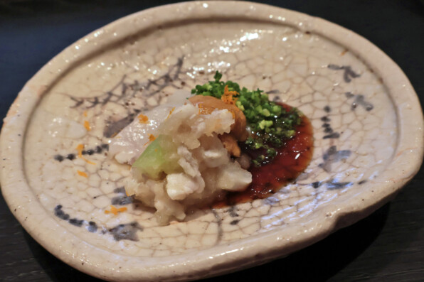 金時にんじんはひらひらで優美。その下に控えているはたは葛たたきにされていて、少しとろっとした口当たり。魚じたい旨い。