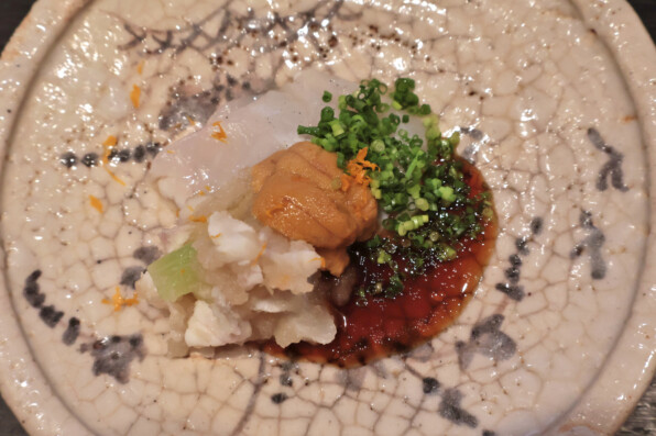 身皮は、おろし酢和え。雲丹、安岡のねぎ、ちしゃとう。
