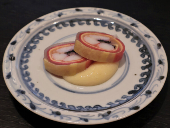 白板昆布、金時にんじん、錦糸卵、大根甘酢漬けで巻いた蟹。