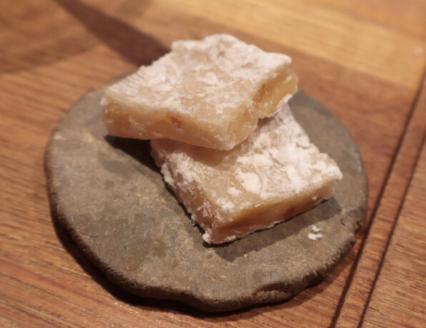 もちもちの食感、味噌の旨味にレーズンの甘みと酸味、胡桃のアクセントで、粋なお菓子でした。