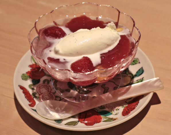 あまおう(いちご)のわらび餅に、あまおうのコンフィチュール。