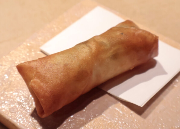 パリパリの食感の中に、生のあおりいか、焼いた菜の花入り。アンチョヴィの風味。