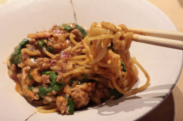 ラオスのスパイシーなラープムー(以前これ味わいました)で和えた麺。