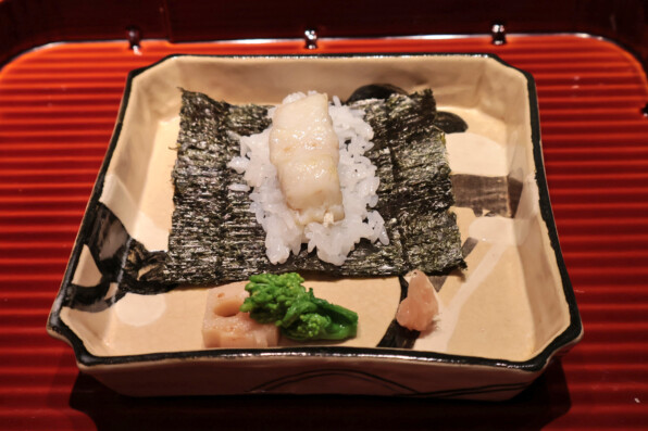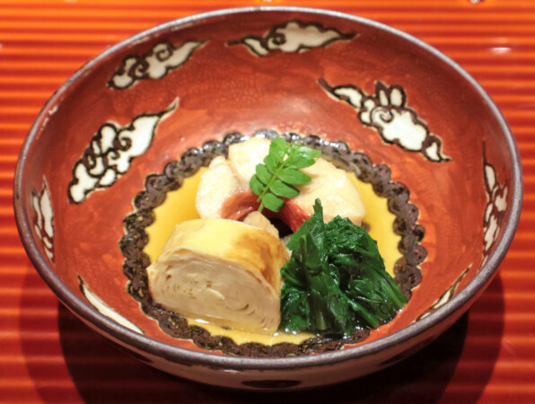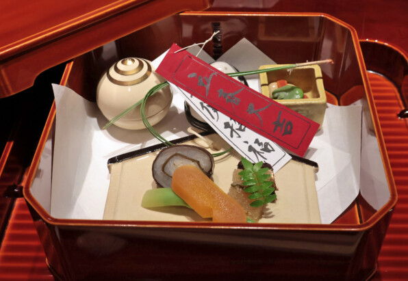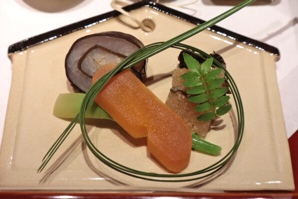 子持ち昆布、木の芽、いわし煮(骨まで柔らかい)、青味大根の昆布締め、一番上にからすみ。