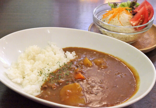まずはアイスカフェオレで涼を取り、平常心に戻ってから、ビーフカレーとサラダを選択。