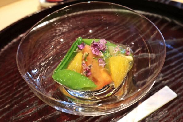 ●春野菜土佐酢ジュレ和え。スナップえんどう、フルーツトマト、うるい、はっさく。花穂紫蘇。