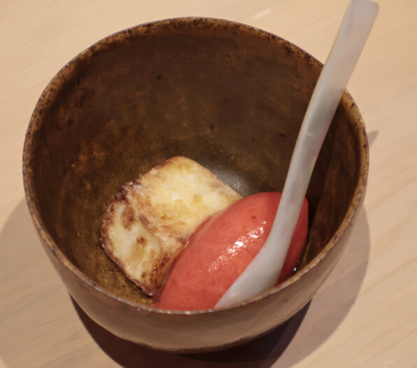 ●白チョコレートの焼きくず餅と、苺のソルベ。