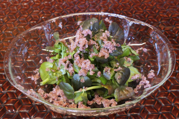 ●クレソンにできたてブレザオラ(牛肉で作った生ハム)をおろして粉々状態にしたものをまぶしたお皿。