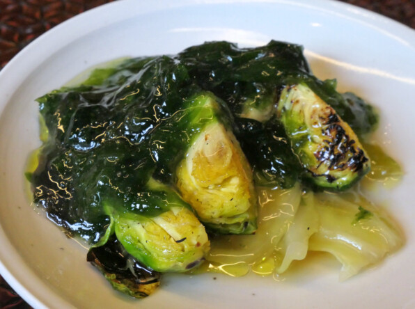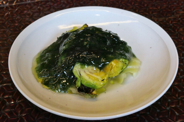 ●春キャベツおひたしに、炭火焼きにした芽キャベツ、上から新青さ海苔あん(鶏だし)。