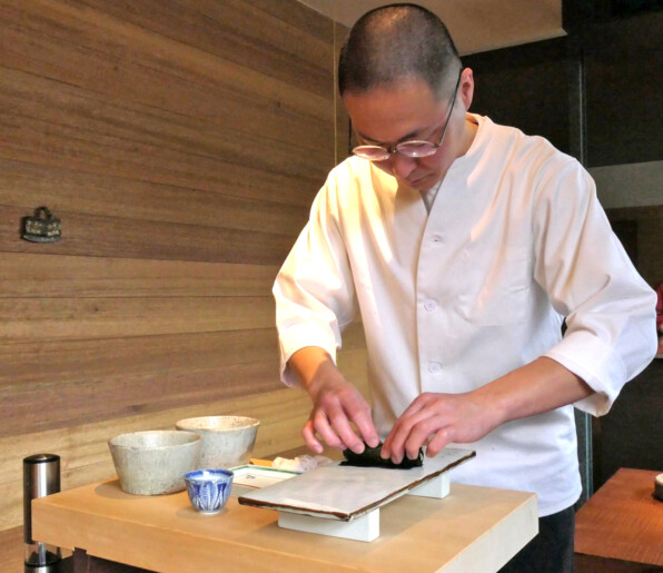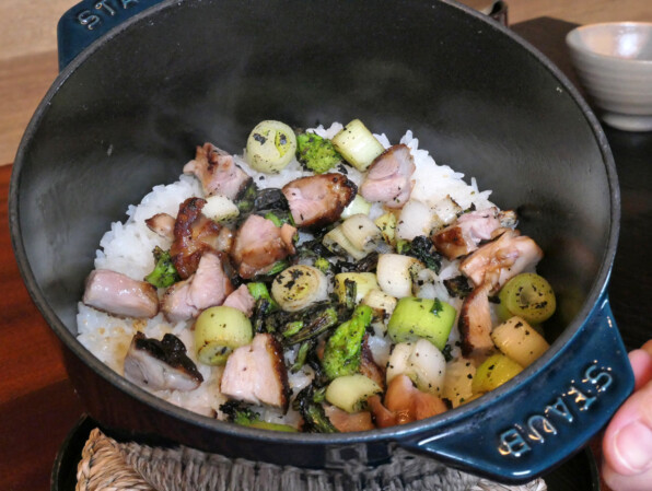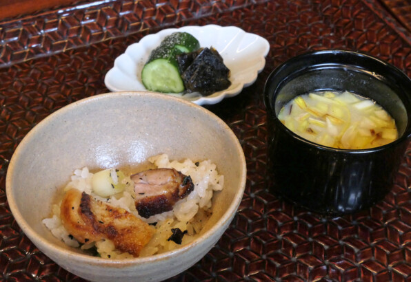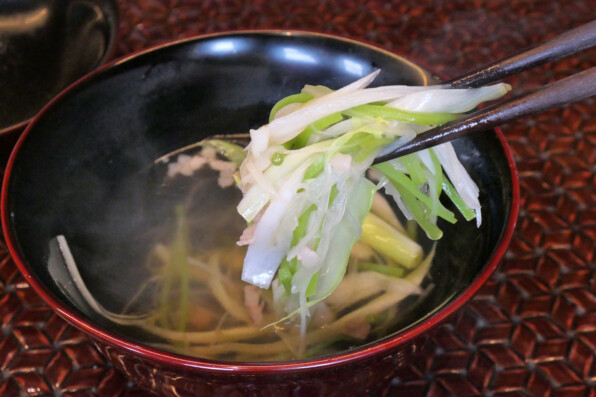 ●沢煮椀。うど、三つ葉、きぬさや、うるい。野菜ばかりのようで、鴨皮の脂で炒りつけて風味を与えている。かつおだしと鶏だしを合わせた吸い地。