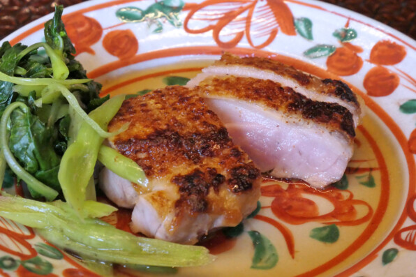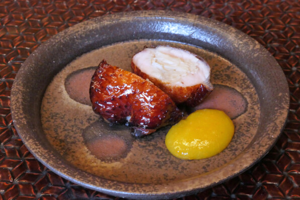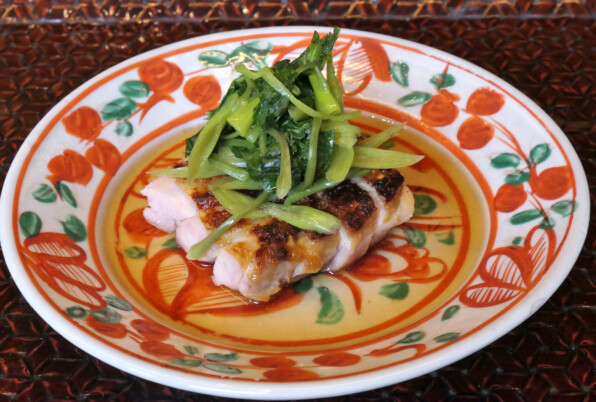●京赤地どり、皮は焼色明確に、身は昆布締めでしっとりと。