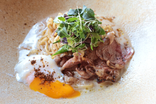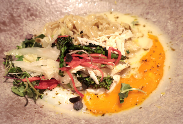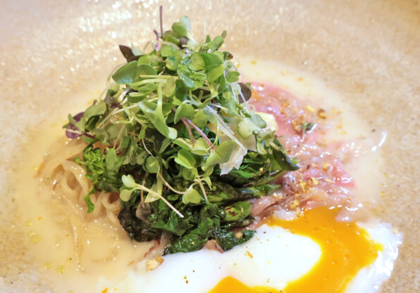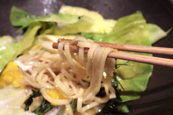 チーズとろりん、たまごとろりんとからめもって味わう平打ち麺、ハーブの香りやお漬物の酸味が楽しく響き合って、もう旨いったらないです。