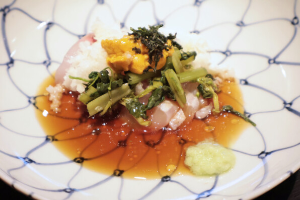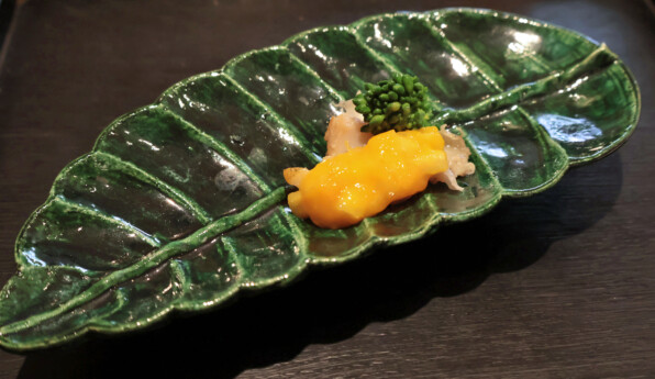 5日間寝かせてねっとり旨味を出したものということ。辛味大根に、これまた辛味のある花山葵、九州からの赤雲丹。上に、有明の一番海苔。