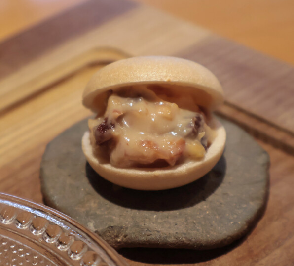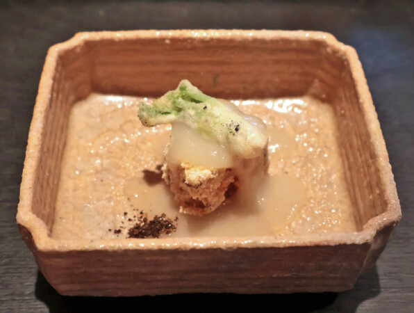 ●ひと皿目、秋田の「一白水成」を食前酒にひと口いただきお料理スタートです。