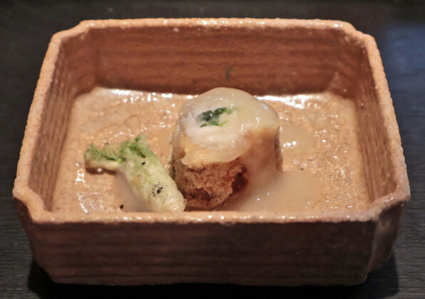 中にうこぎを仕込んでくるくる巻いたのを、砕いたおかきを衣にして揚げたもの。