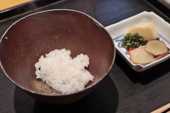 ●炊きたて白ご飯と自家製5種類のオリジナルのお漬物です。