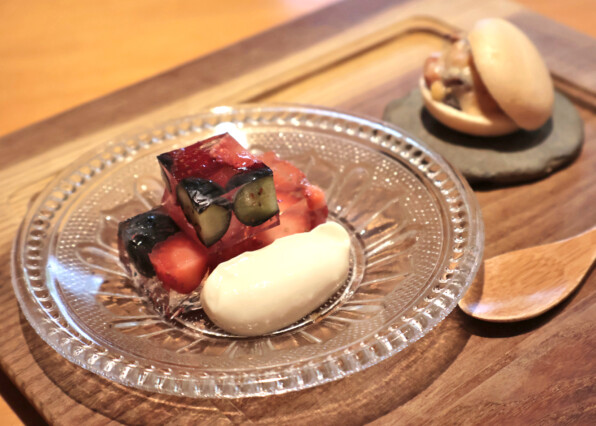 手前が、ブルーベリーといちごの乳清ゼリー寄せ。乳清クリームと。