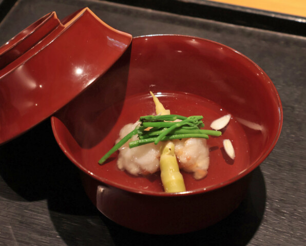 ●お椀は伊勢海老の葛たたき。ひめたけ。緑色のは「しおで」、山アスパラガスとも呼ばれるもので、山菜。柚子の花。