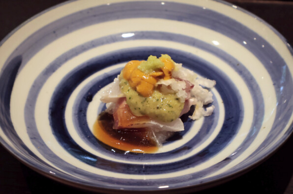 雲丹、わさび、辛味大根、酢取りの新玉ねぎ。ぽん酢吉野。