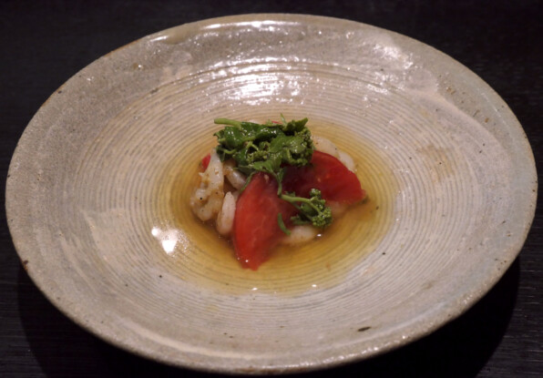 ●京都のトマトと炭焼きにした白海老、吸酢。花山椒。