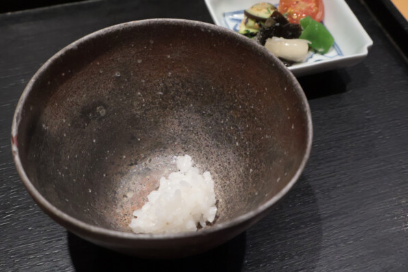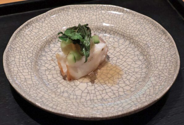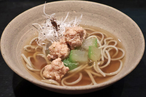しゃも挽き肉の丸(がん)は塩気明確、冬瓜の方は塩気なしでひとえに涼しげな美しさとすっきりした食感を添えて、よいバランス。