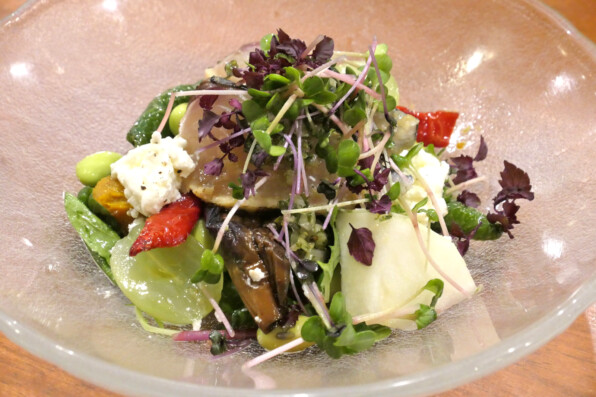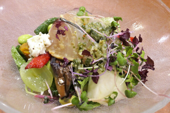 自家製リコッタ、シャインマスカット、洋梨(レッドコミス)、青森の毛豆、茄子バルサミコマリネ、かぼちゃマリネ、緑と赤の万願寺とうがらし、ベビーリーフやスプラウトいろいろ。
