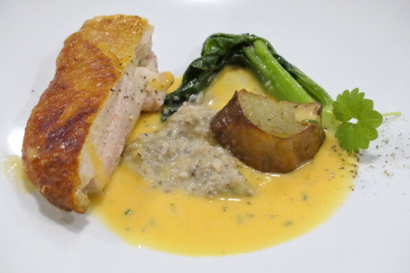 ソース シュプレームに、パプリカ、エストラゴンで風味付けしたもの。シャペルさんはトリュフを使うが、これはトリュフ塩でごめん😂🙏というものでした。