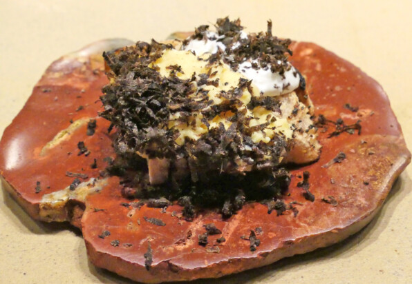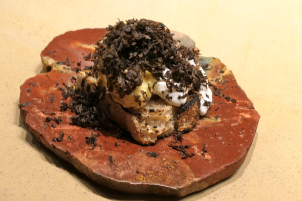 全粒粉のパン、分厚い発酵バター、ストラッチャテッラ、安納芋のピュレ、黒トリュフをばさばさと😭😭