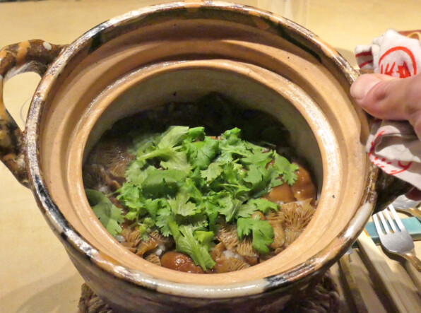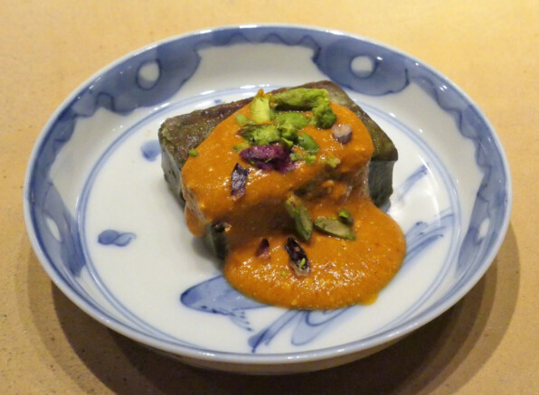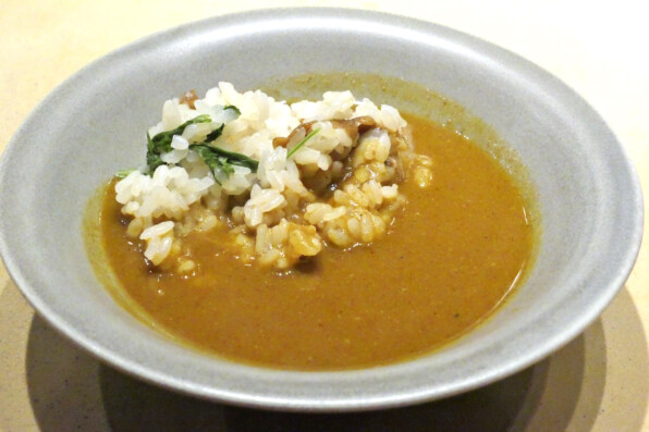 今回は、鮑の肝ベースのスープ。ダイス状の鮑、里芋、もち麦。