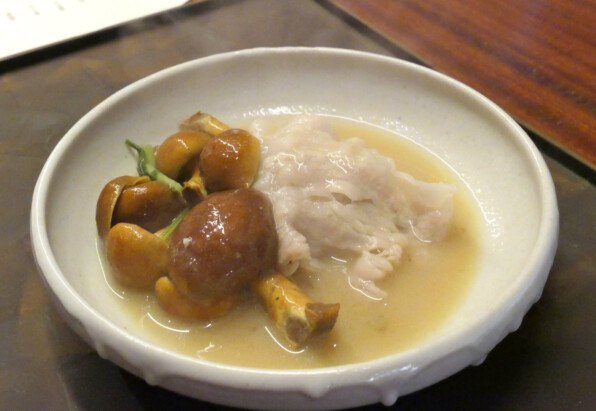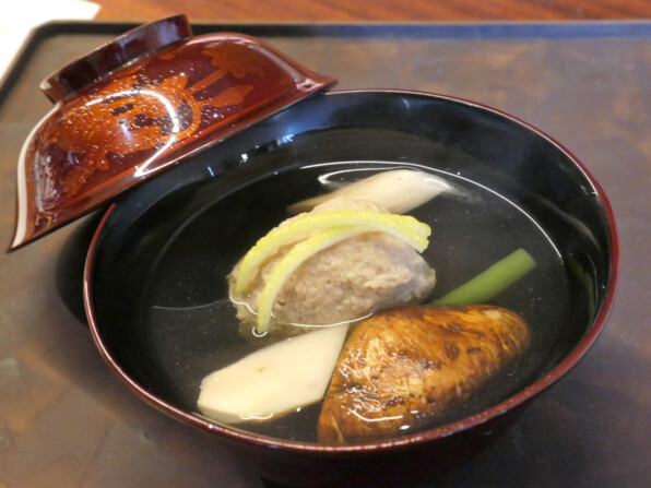 豚となめこの白味噌仕立てに、こぶみかんの葉の香りがつけられていたのです。