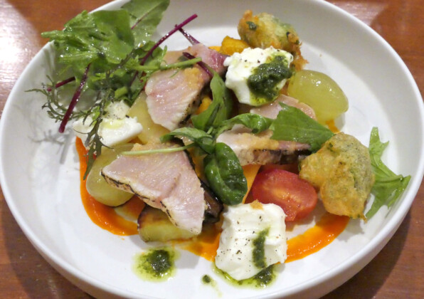 野菜はフルーツトマト、さつまいも、茄子のバルサミコマリネ、南瓜のマリネ、ベビーリーフ。