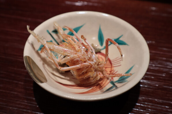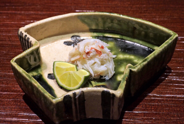 織部のお皿で供されたのはずわい蟹を蒸したもの。シンプルにすだちで。