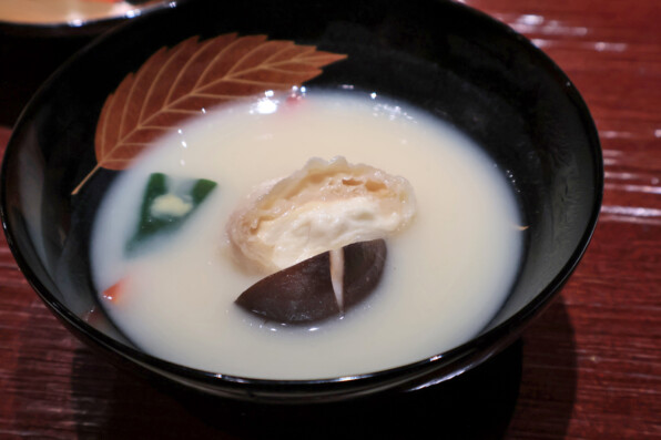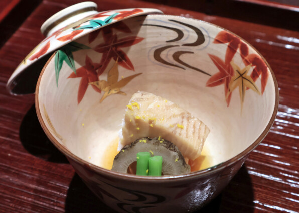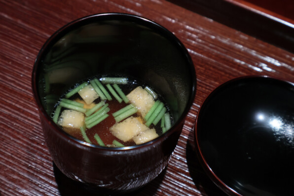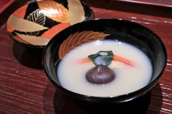 どんぐりの葉のモチーフが美しい輪島塗りのお椀で、白味噌仕立て。