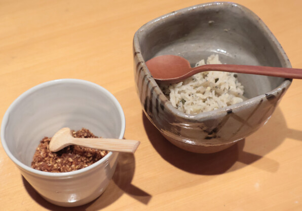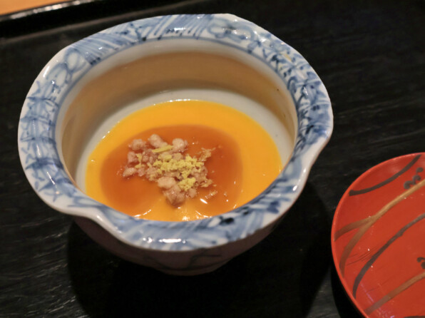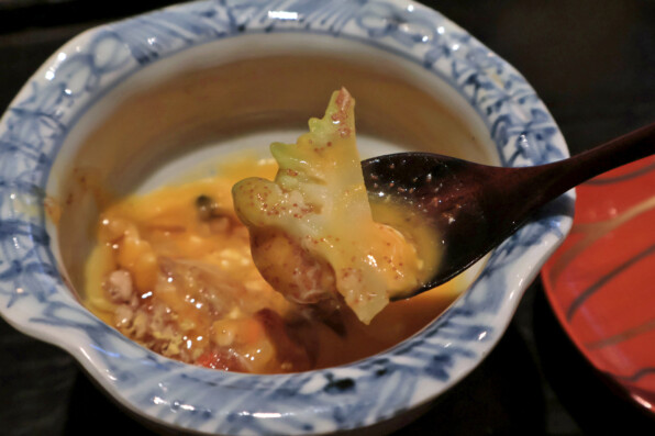 いやもう、スプーンですくい上げてもすくい上げても、いろいろ出てきて楽しくて、すべて食感違って彩りもきれい、先付から何この飛ばし方と、もうれつにわたしにも気合が入りました。