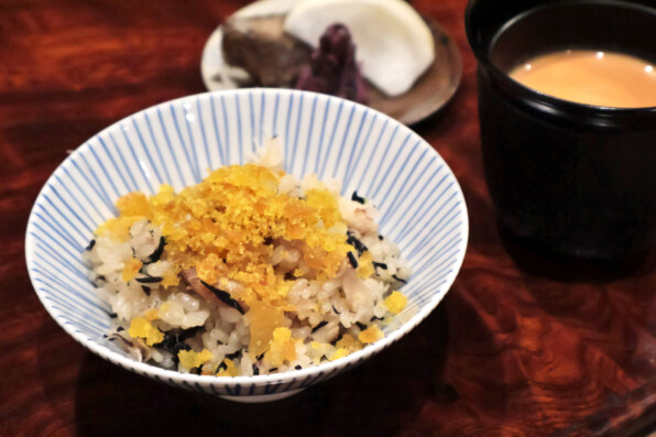 ●ご飯は、ぐじとひじきの炊き込みご飯。からすみ。