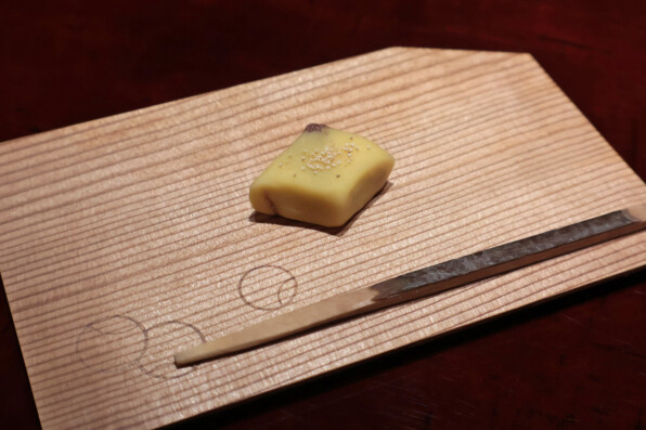 ●ひな祭にちなんで、ひし形です。裏ごしして卵黄と合わせた百合根に、あんを合わせてマーブル模様にしたお菓子。上からけしの実。