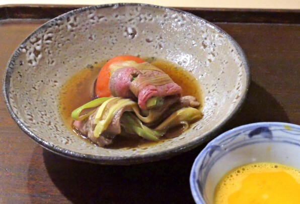 和牛に、白と緑のアスパラガス、トマト。溶き卵が添えられて、おだしも全飲みしました。
