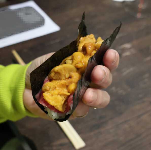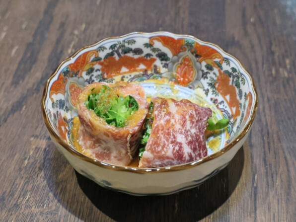 ●牛肉生ハムの、スモークサーモン巻き。中にかいわれ菜。