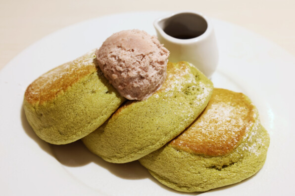 京都限定、有機抹茶の小倉バターパンケーキ 黒蜜添え