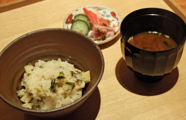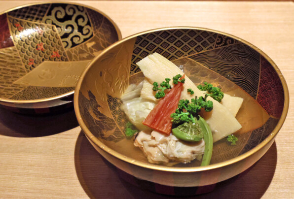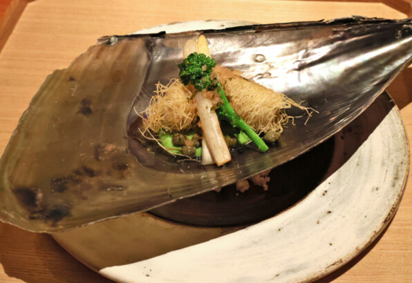 桑名のはまぐりの昆布〆に、洛西の筍、春キャベツ。花山椒、ばちこ、こごみ。