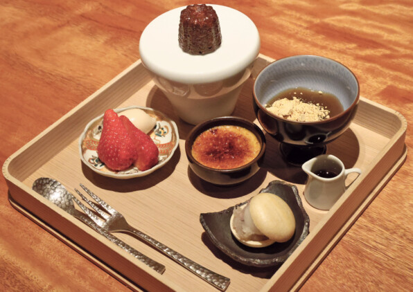 カヌレ、わらび餅、塩カラメルクレームブリュレ、桜あんのもなか、酒粕とブラッドオレンジのアイスクリーム、いちごは古都華。