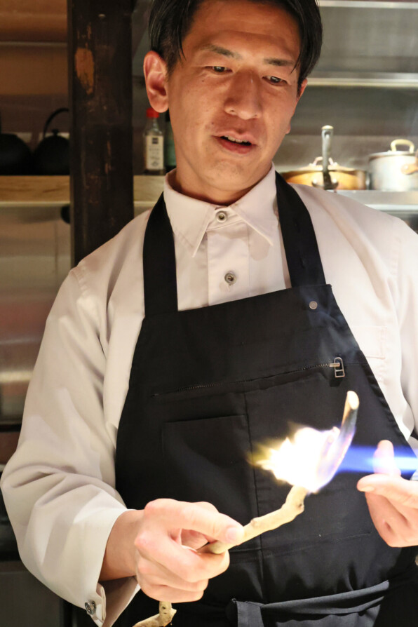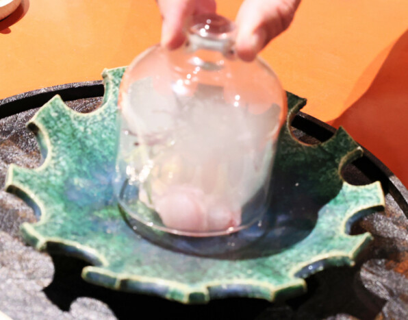 ●100年のお茶の木で目の前で燻香をつけられた、黒むつ。