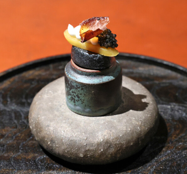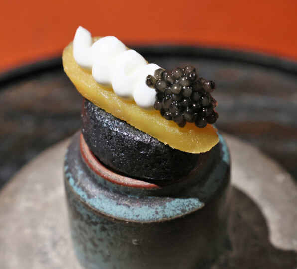 炭で黒くした米粉パン、からすみ、水切りヨーグルト、カヴィア、ほたてチップ。