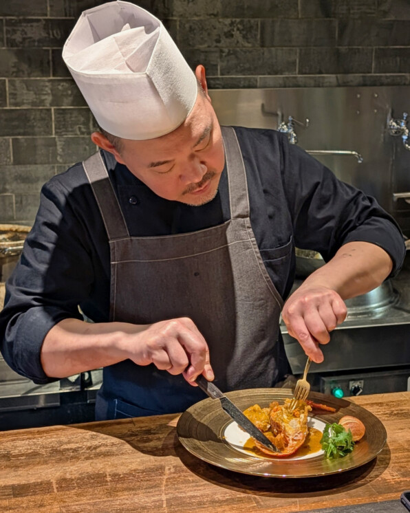 ●伊勢海老の外し方をプレゼンしてくださる店主の上岡誠さん。