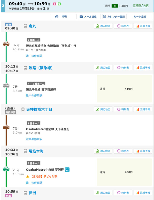 ●こうやって行けば、なんと1時間19分で烏丸→夢洲へ行けました。