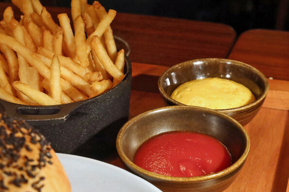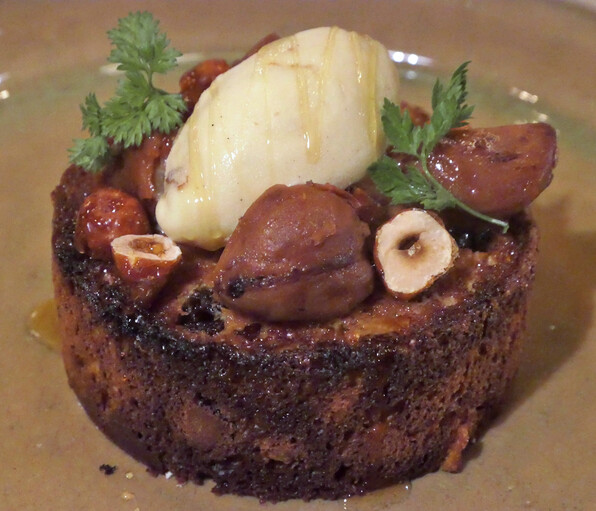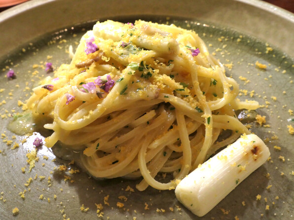 大浦ごぼう、蜂蜜とバルサミコを合わせたソース、上に玉ねぎコンフィチュール。