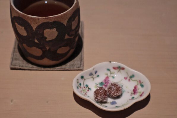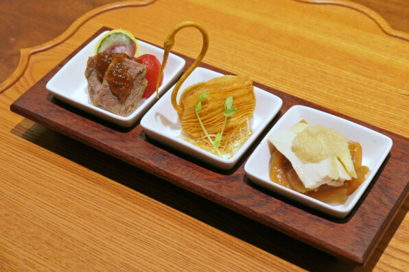 柿と梨、レモンとオリーヴオイルと塩でマリネ、青柚子の皮。